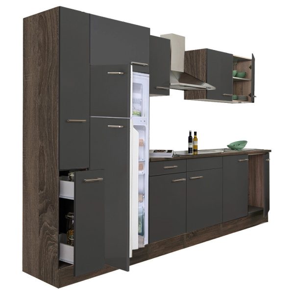 Yorki 300 konyhabútor Tölgy korpusz selyemfényű antracit fronttal 300 cm Felülfagyasztós hűtős kamraszekrénnyel