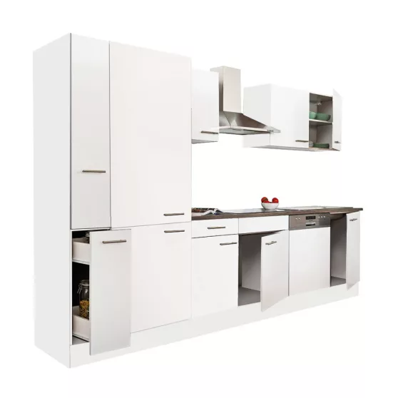 Yorki 310 beépíthető konyhabútor Fehér korpusz selyemfényű fehér fronttal 310 cm Polcos kamraszekrénnyel